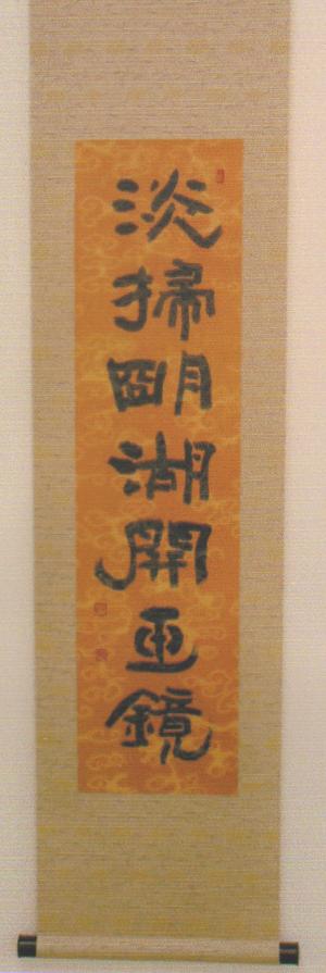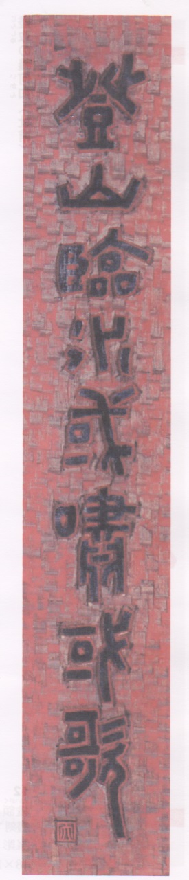 ❶隷書❷書軸 茶掛 ❸染紙濃墨 ❹李白 ❺ 関防印「一遇」 ❻ 46×200/33×134㎝ ❼ 制作 2003 ❽番号:大228