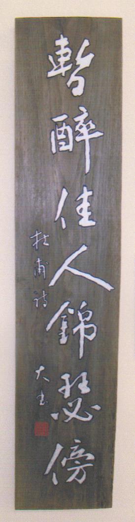 ❶行書 ❷書刻 楹額 ❸梨板 藍染 ❹彫込 筋彫 文字白 ❺ 杜甫 ❻20×94cm ❼制作 2003 ❽番号:大223 ❾個人蔵