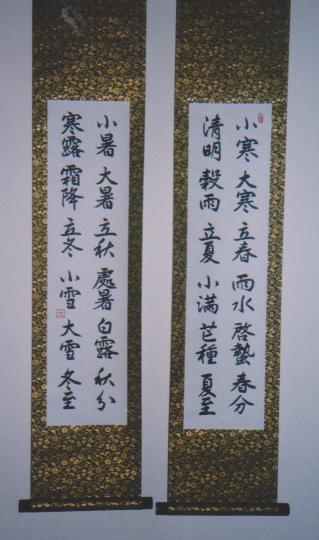 ❶ 行書 ❷ 書軸 対聯 ❸ 紙本濃墨 ❹ 二十四節気 ❺ 関防印「節気」 ❻ 100×18cm×2本 ❼ 制作 2004 ❽ 番号:大225