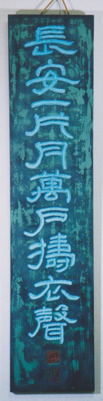 ❶隷書 ❷書刻 ❸杉板 緑漆研出 ❹彫込 刳彫 文字色:青 ❺ 李白 ❻ 20×91cm ❼ 制作 1999 ❽ 番号大229